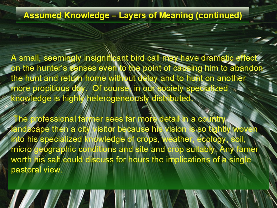A small, seemingly insignificant bird call may have dramatic effect on the hunter’s senses even to the point of causing him to abandon the hunt and return home without delay and to hunt on another more propitious day. Of course, in our society specialized knowledge is highly heterogeneously distributed. The professional farmer sees far more detail in a country landscape then a city visitor because his vision is so tightly woven into his specialized knowledge of crops, weather, ecology, soil, micro geographic conditions and site and crop suitably. Any famer worth his salt could discuss for hours the implications of a single pastoral view.