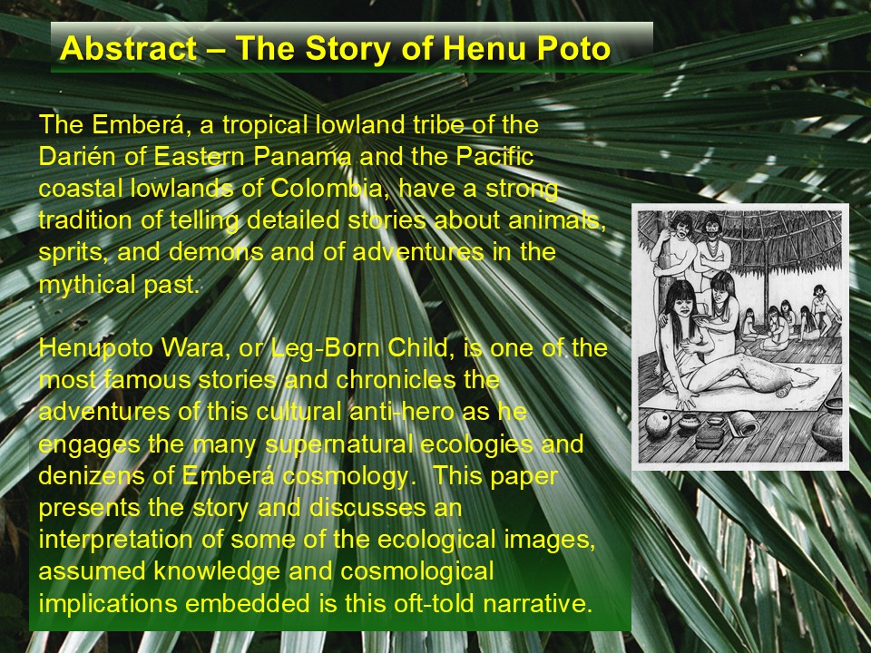 The Emberá, a tropical lowland tribe of the Darién of Eastern Panama and the Pacific coastal lowlands of Colombia, have a strong tradition of telling detailed stories about animals, sprits, and demons and of adventures in the mythical past. Henupoto Wara, or Leg-Born Child, is one of the most famous stories and chronicles the adventures of this cultural anti-hero as he engages the many supernatural ecologies and denizens of Emberá cosmology. This paper presents the story and discusses an interpretation of some of the ecological images, assumed knowledge and cosmological implications embedded is this oft-told narrative.