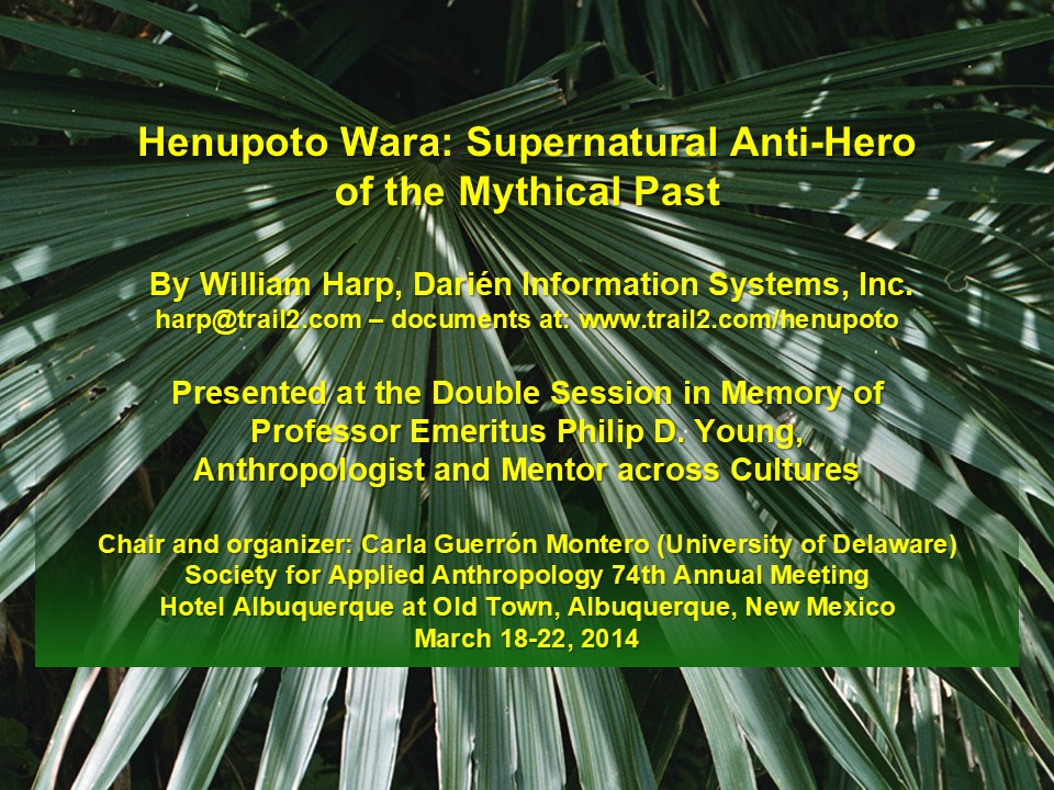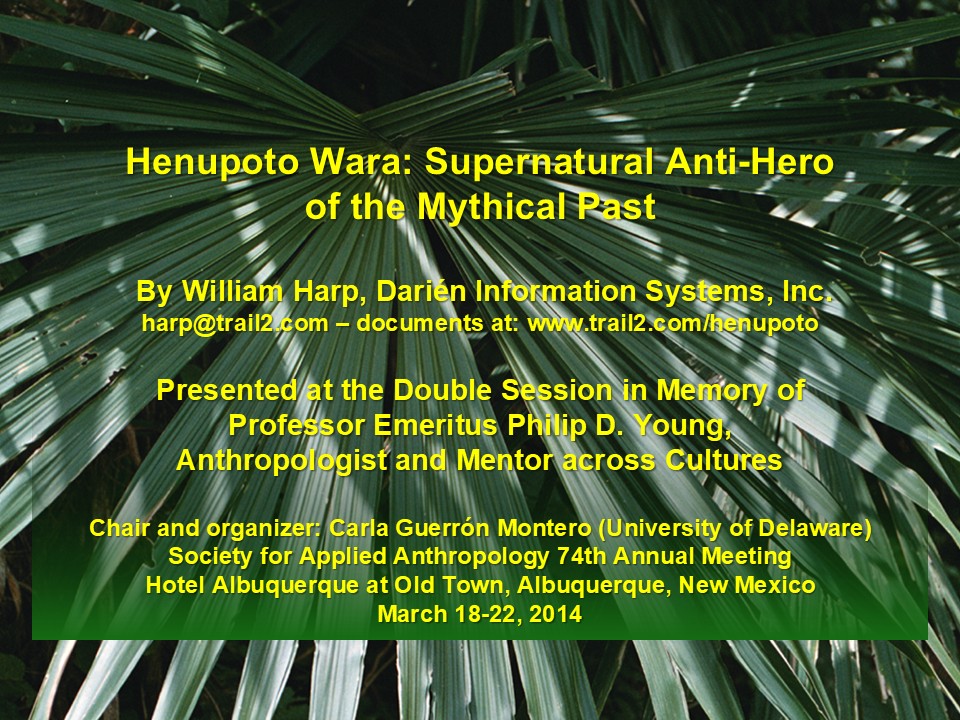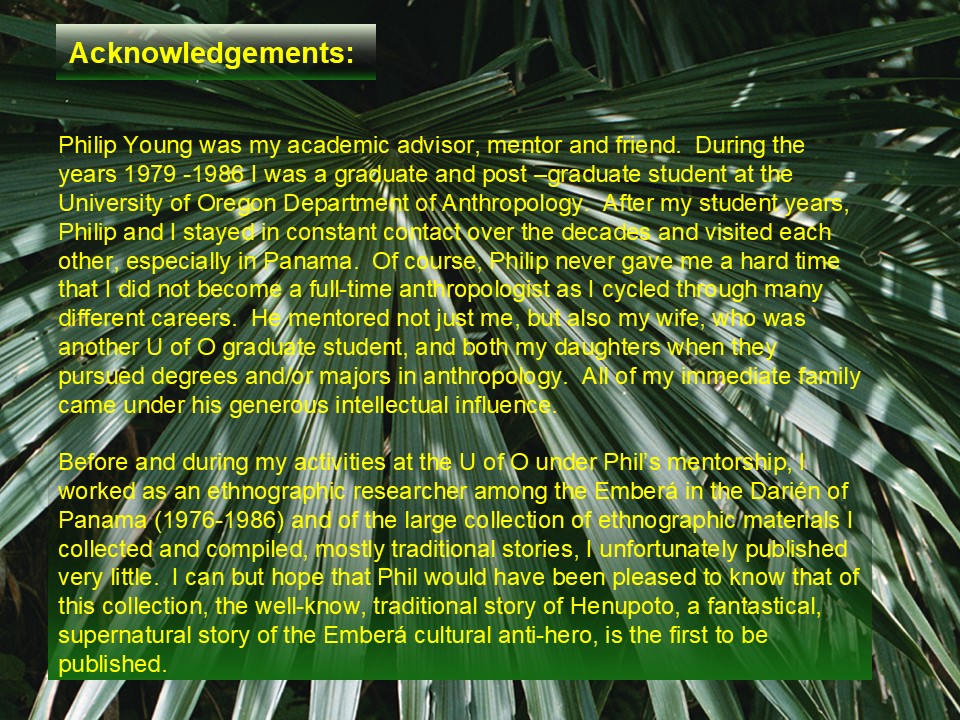 Philip Young was my academic advisor, mentor and friend. During the years 1979 -1986 I was a graduate and post –graduate student at the University of Oregon Department of Anthropology. After my student years, Philip and I stayed in constant contact over the decades and visited each other, especially in Panama. Of course, Philip never gave me a hard time that I did not become a full-time anthropologist as I cycled through many different careers. He mentored not just me, but also my wife, who was another U of O graduate student, and both my daughters when they pursued degrees and/or majors in anthropology. All of my immediate family came under his generous intellectual influence. Before and during my activities at the U of O under Phil’s mentorship, I worked as an ethnographic researcher among the Emberá in the Darién of Panama (1976-1986) and of the large collection of ethnographic materials I collected and compiled, mostly traditional stories, I unfortunately published very little. I can but hope that Phil would have been pleased to know that of this collection, the well-know, traditional story of Henupoto, a fantastical, supernatural story of the Emberá cultural anti-hero, is the first to be published.