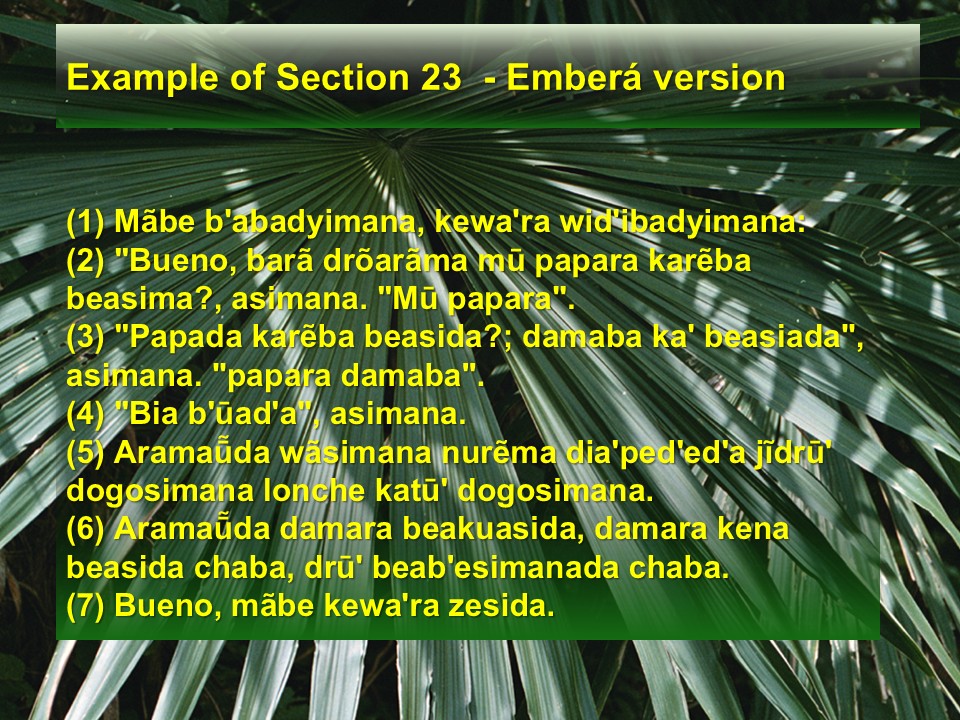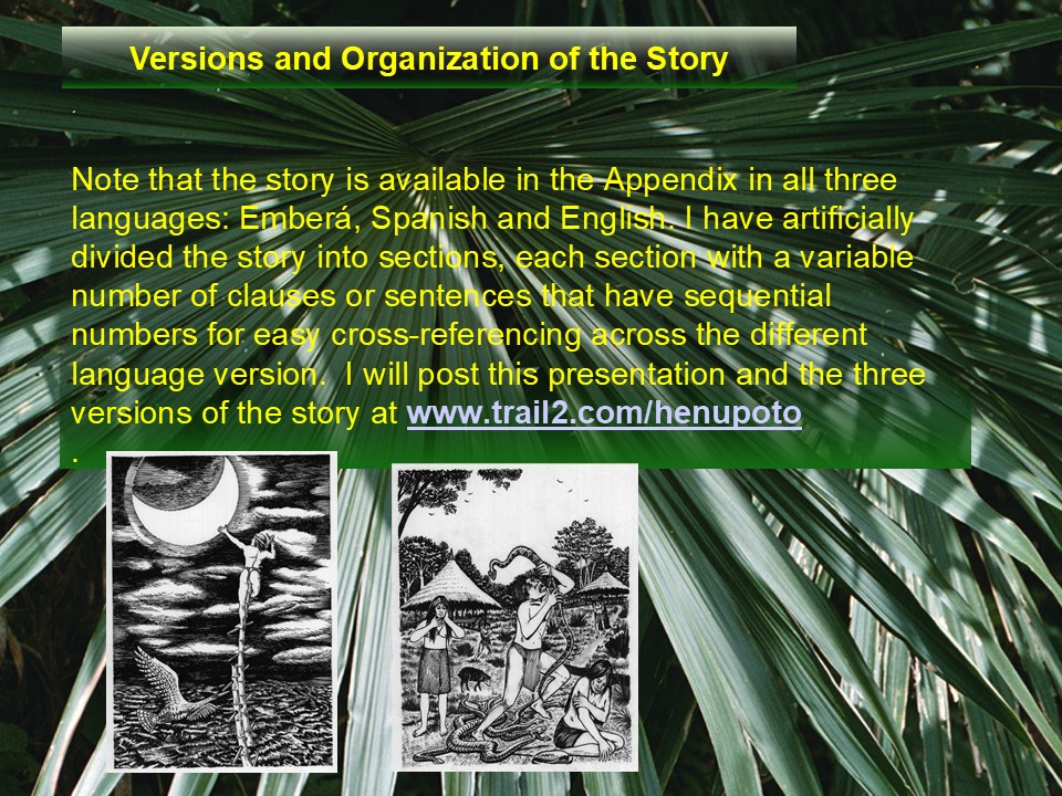 Note that the story is available in the Appendix in all three languages: Emberá, Spanish and English. I have artificially divided the story into sections, each section with a variable number of clauses or sentences that have sequential numbers for easy cross-referencing across the different language version. I will post this presentation and the three versions of the story at www.trail2.com/henupoto