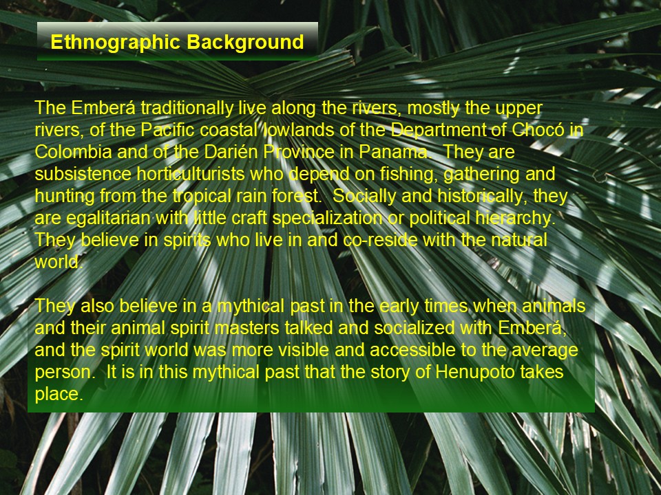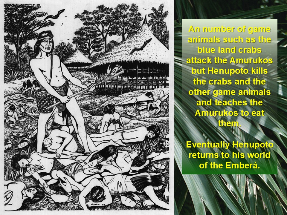 They also believe in a mythical past in the early times when animals and their animal spirit masters talked and socialized with Emberá, and the spirit world was more visible and accessible to the average person. It is in this mythical past that the story of Henupoto takes place.