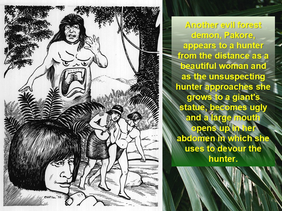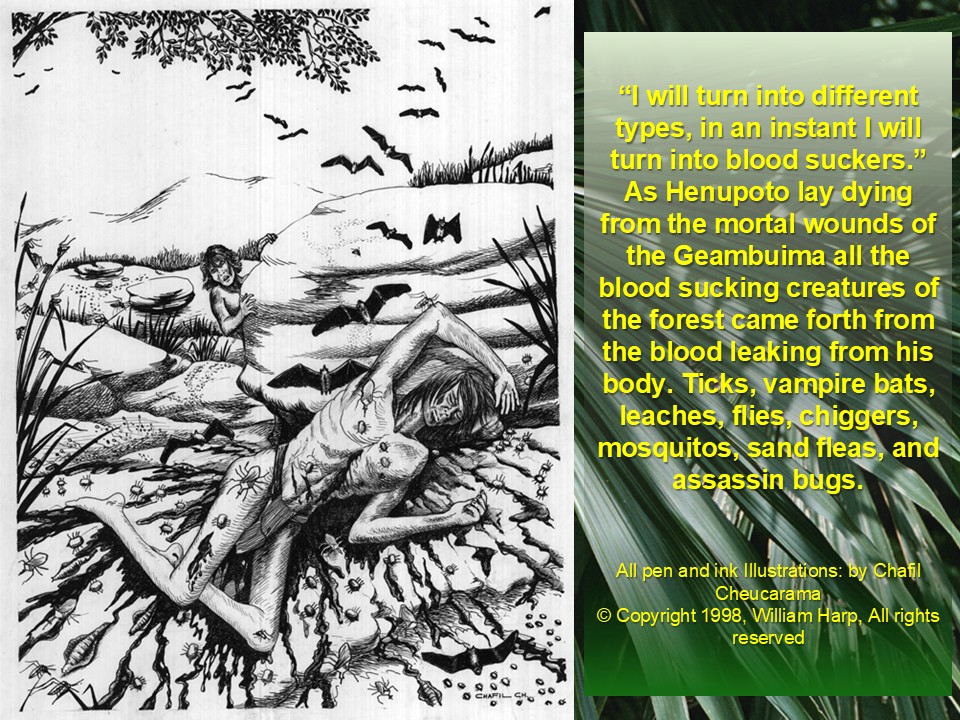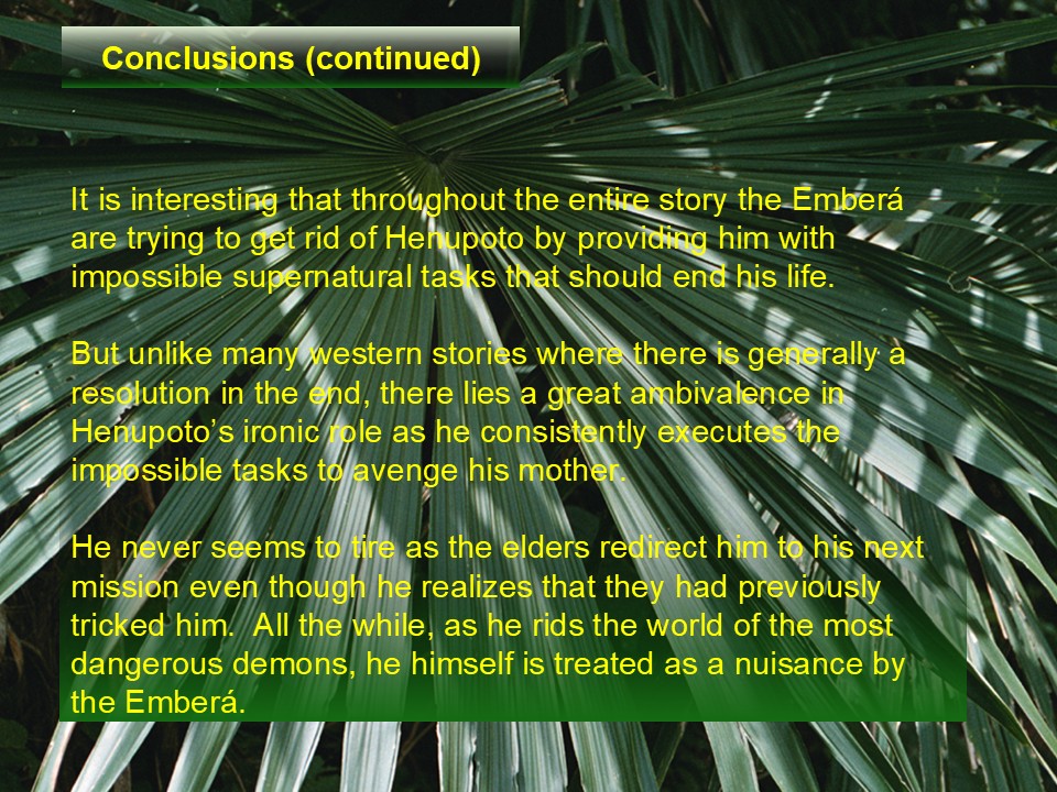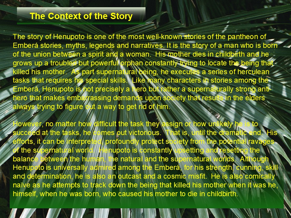 However, no matter how difficult the task they assign or how unlikely he is to succeed at the tasks, he comes out victorious. That is, until the dramatic end. His efforts, it can be interpreted, profoundly protect society from the potential ravages of the supernatural world. Henupoto is constantly upsetting and resetting the balance between the human, the natural and the supernatural worlds. Although Henupoto is universally admired among the Emberá, for his strength, cunning, skill and determination, he is also an outcast and a cosmic misfit. He is also comically naïve as he attempts to track down the being that killed his mother when it was he, himself, when he was born, who caused his mother to die in childbirth.