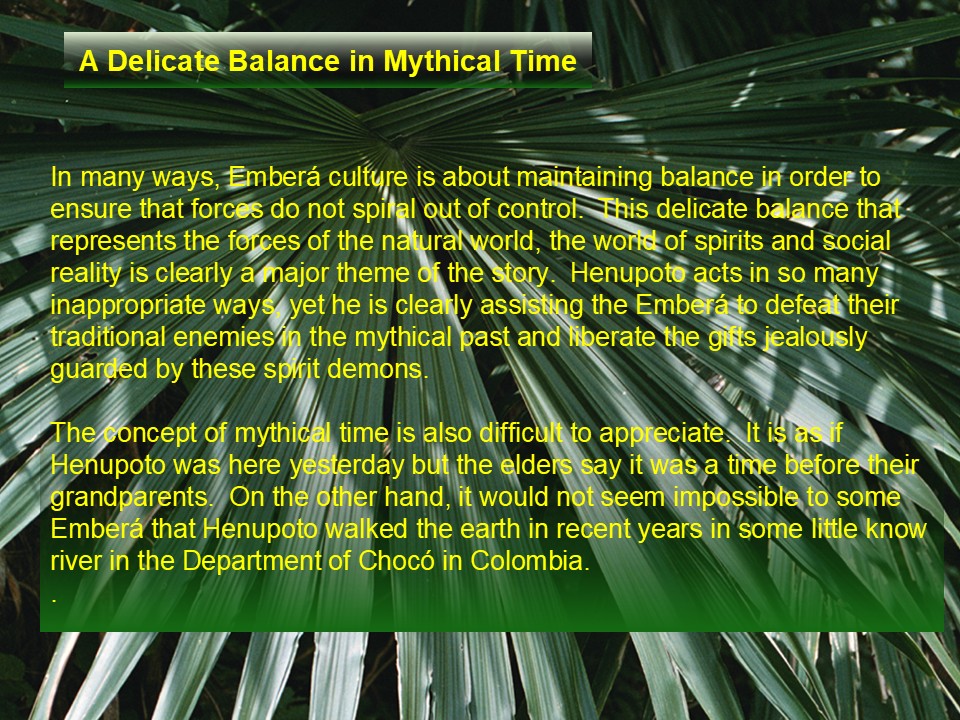 In many ways, Emberá culture is about maintaining balance in order to ensure that forces do not spiral out of control. This delicate balance that represents the forces of the natural world, the world of spirits and social reality is clearly a major theme of the story. Henupoto acts in so many inappropriate ways, yet he is clearly assisting the Emberá to defeat their traditional enemies in the mythical past and liberate the gifts jealously guarded by these spirit demons.