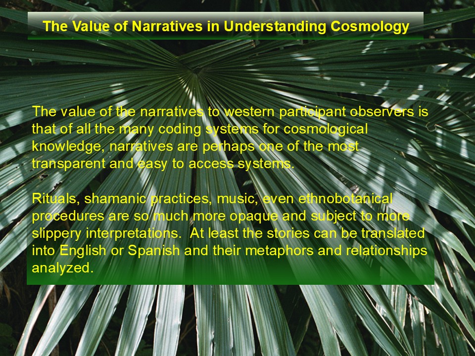The value of the narratives to western participant observers is that of all the many coding systems for cosmological knowledge, narratives are perhaps one of the most transparent and easy to access systems. Rituals, shamanic practices, music, even ethnobotanical procedures are so much more opaque and subject to more slippery interpretations. At least the stories can be translated into English or Spanish and their metaphors and relationships analyzed.
