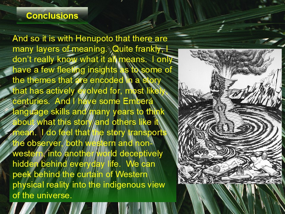 And so it is with Henupoto that there are many layers of meaning. Quite frankly, I don’t really know what it all means. I only have a few fleeting insights as to some of the themes that are encoded in a story that has actively evolved for, most likely, centuries. And I have some Emberá language skills and many years to think about what this story and others like it mean. I do feel that the story transports the observer, both western and non-western, into another world deceptively hidden behind everyday life. We can peek behind the curtain of Western physical reality into the indigenous view of the universe. Certainly, there is not one or even a “correct” meaning to the story. I suggest it is more like a code that provides a vehicle for delivering Emberá cosmology and its attendant lessons in an easy to consume, and reproducible package with potentially many layers of meaning and interpretations. The elements of the code resonate with the consonant level of knowledge of the listeners. Like all good stories, each layer of meaning envelops and articulates with the personal experience, social and cultural matrix of the listener.