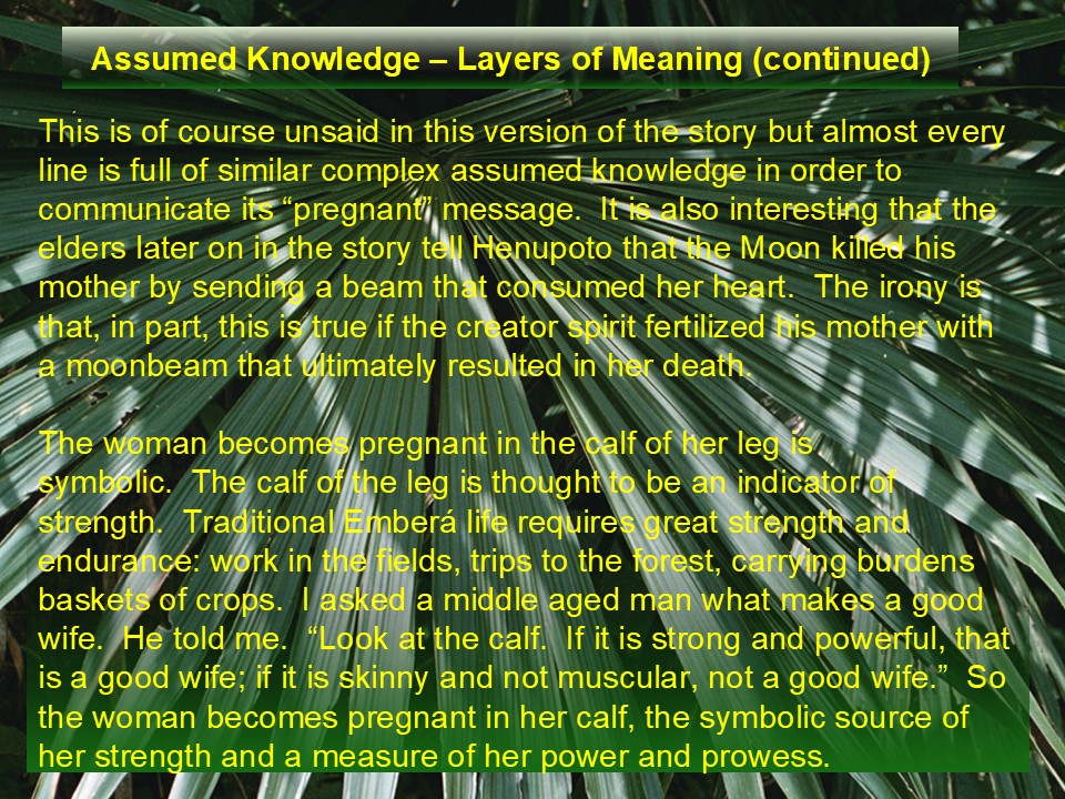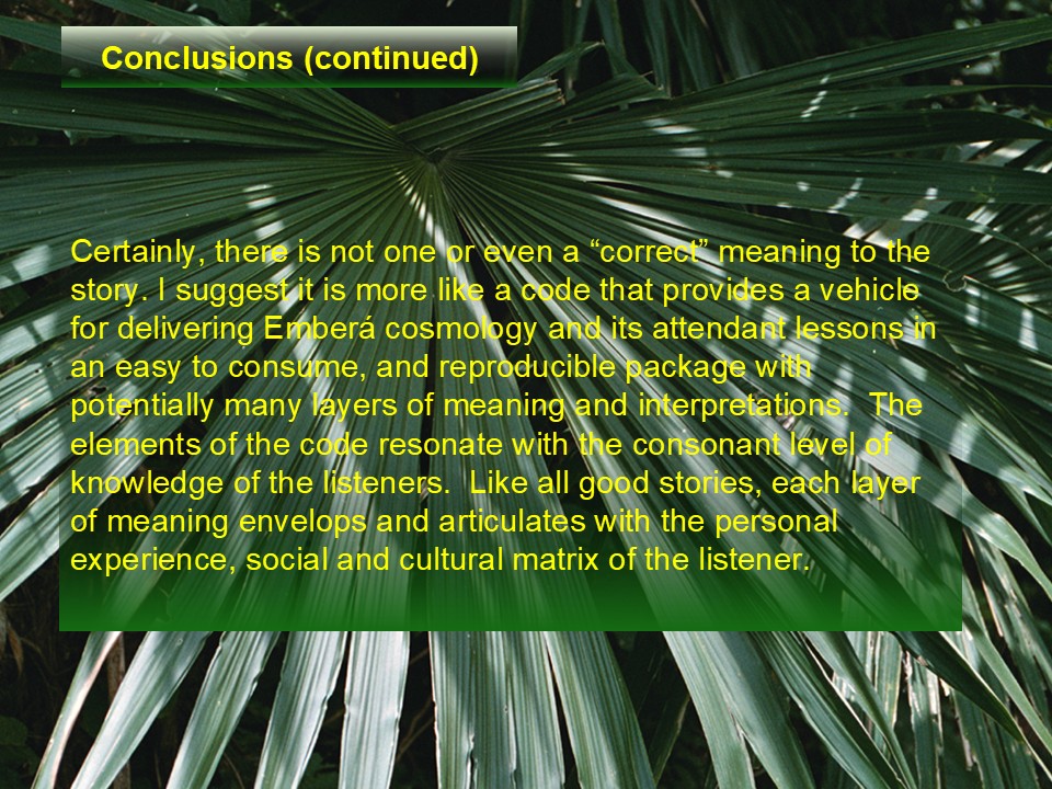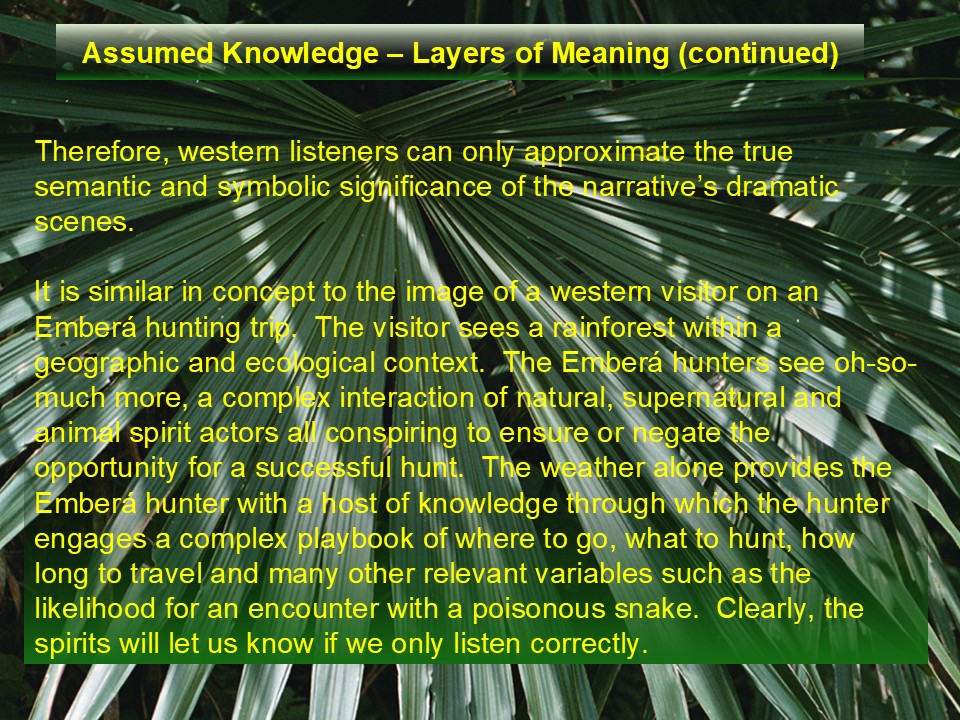 Notwithstanding their apparent transparency, Emberá narratives are crammed full of assumed knowledge on the part of the listener. The stories articulate within a system of beliefs, a method of thinking about and encoding the nature of mind, spirit, social roles, culture, ecology and the cosmos.
