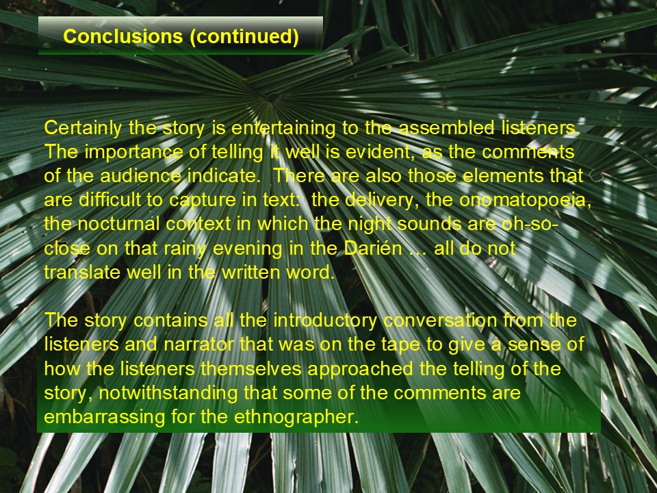 Certainly the story is entertaining to the assembled listeners. The importance of telling it well is evident, as the comments of the audience indicate. There are also those elements that are difficult to capture in text: the delivery, the onomatopoeia, the nocturnal context in which the night sounds are oh-so-close on that rainy evening in the Darién … all do not translate well in the written word. The story contains all the introductory conversation from the listeners and narrator that was on the tape to give a sense of how the listeners themselves approached the telling of the story, notwithstanding that some of the comments are embarrassing for the ethnographer.