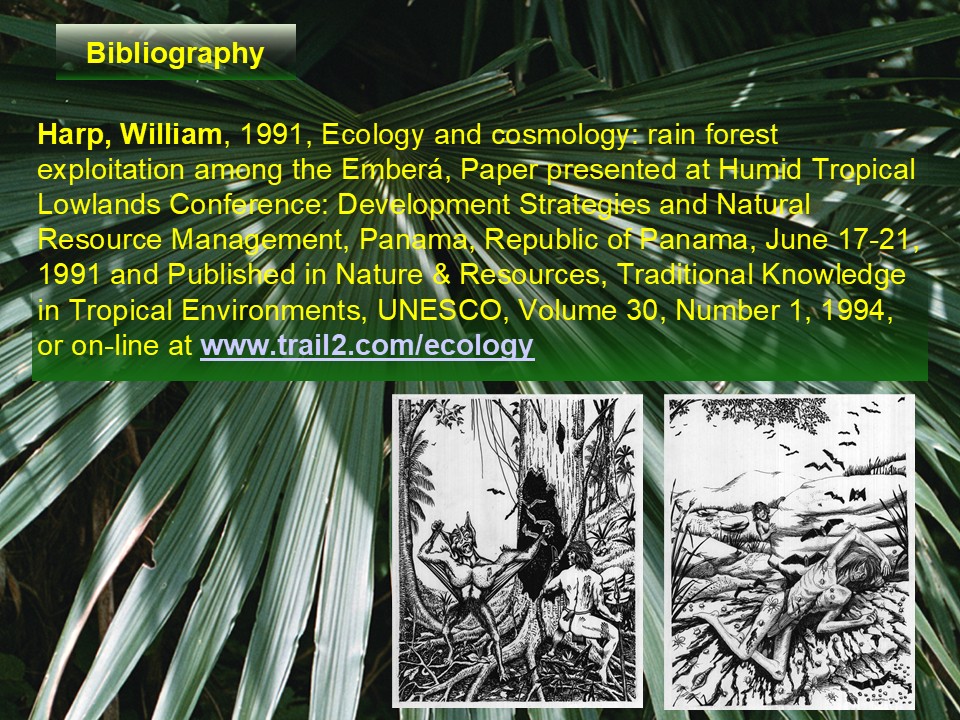Harp, William, 1991, Ecology and cosmology: rain forest exploitation among the Emberá, Paper presented at Humid Tropical Lowlands Conference: Development Strategies and Natural Resource Management, Panama, Republic of Panama, June 17-21, 1991 and Published in Nature & Resources, Traditional Knowledge in Tropical Environments, UNESCO, Volume 30, Number 1, 1994, or on-line at www.trail2.com/ecology