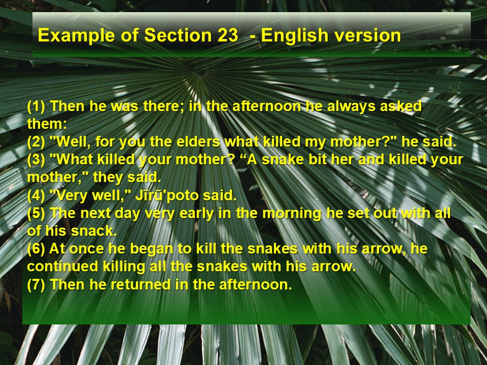 (1) Then he was there; in the afternoon he always asked them: (2) “Well, for you the elders what killed my mother?” he said. (3) “What killed your mother? A snake bit her and killed your mother,” they said. (4) “Very well,” Jĩrũ’poto said. (5) The next day very early in the morning he set out with all of his snack. (6) At once he began to kill the snakes with his arrow, he continued killing all the snakes with his arrow. (7) Then he returned in the afternoon.