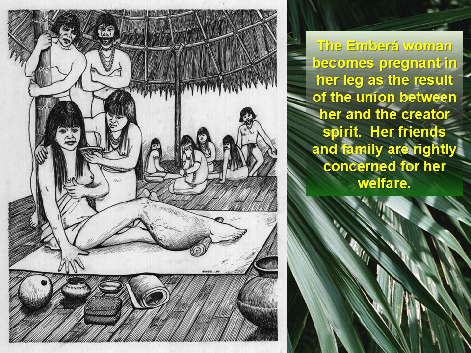 The woman becomes pregnant in the calf of her leg is symbolic. The calf of the leg is thought to be an indicator of strength. Traditional Emberá life requires great strength and endurance: work in the fields, trips to the forest, carrying burdens baskets of crops. I asked a middle aged man what makes a good wife. He told me. “Look at the calf. If it is strong and powerful, that is a good wife; if it is skinny and not muscular, not a good wife.” So the woman becomes pregnant in her calf, the symbolic source of her strength and a measure of her power and prowess.