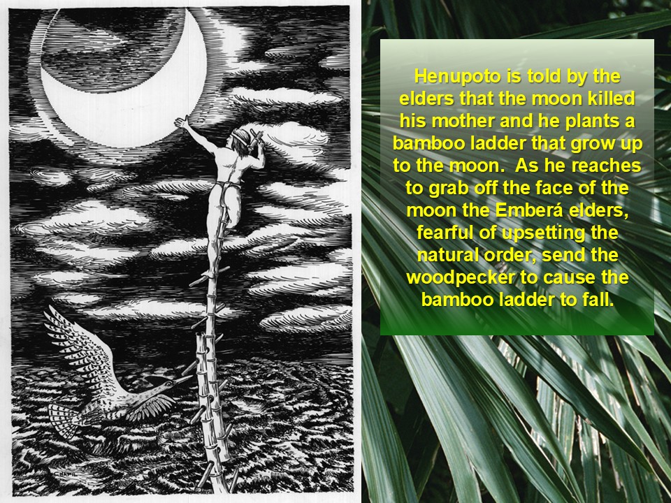 For example, when Alipio says “our father,” this is really Ancoré, a powerful creator spirit, and it is really most likely that the missionaries have insisted that Ancoré be interpreted as “our father.” And when Alipio states that the father spirit made love to the young woman between her toes, it is likely that many Emberá listeners are actually visualizing something like a crystalline, pale white beam of moonlight that pierces the thatch roof and enters the young woman’s foot to fertilize her with child. The Western assumption is most likely that of the image of male-female physical sexual intercourse between her toes. This is of course unsaid in this version of the story but almost every line is full of similar complex assumed knowledge in order to communicate its “pregnant” message. It is also interesting that the elders later on in the story tell Henupoto that the Moon killed his mother by sending a beam that consumed her heart. The irony is that, in part, this is true if the creator spirit fertilized his mother with a moonbeam that ultimately resulted in her death.