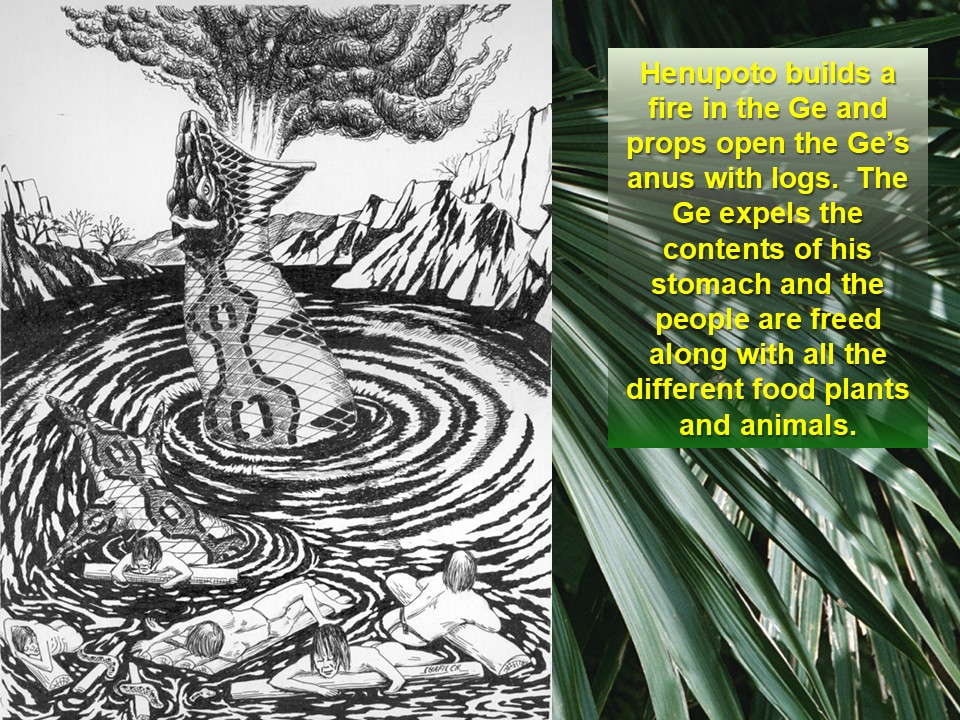 (1) He went to see the entrance of the river. (2) Then he picked up some firewood and made a fire on the beach.. (3) He also had his balsa there tied in the river. (4) Well, then he came and he cut the heart of the Ge… (5) “And he did not feel it?”…he did not feel. (6) As soon as he cut the heart of the Ge he began to drink the blood from above. (7) He is drinking like this… (8) “And did he also drink the blood of a fish?”…he drank the blood of the Ge. (9) In one blow he opened the heart of the Ge and cut it in very thin strips. (10) Then he skewered it on some twigs and put the meat on to cook. (11) Well, he ate the heart of that Ge. (12) Well, he gave those pale Emberá that were there inside something to eat.