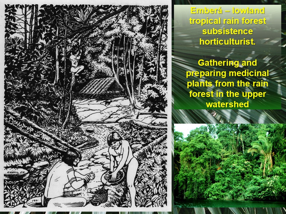 The Emberá traditionally live along the rivers, mostly the upper rivers, of the Pacific coastal lowlands of the Department of Chocó in Colombia and of the Darién Province in Panama. They are subsistence horticulturists who depend on fishing, gathering and hunting from the tropical rain forest. Socially and historically, they are egalitarian with little craft specialization or political hierarchy. They believe in spirits who live in and co-reside with the natural world.